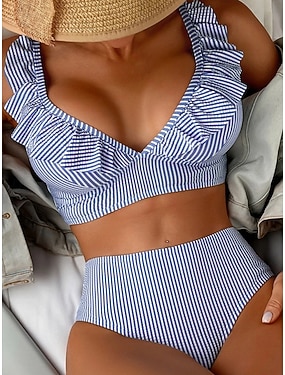 Femmes Maillots de Bain Bikini 2 pièces Slips Maillot de bain A Volants Mince Dos nu Vacances Tenues de plage Rayé Col en V Sans manches Maillots de bain