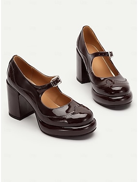 Escarpins à talon carré Mary Jane en cuir verni marron pour femmes avec détails brogue - chaussures habillées d'inspiration vintage pour le bureau et le soir