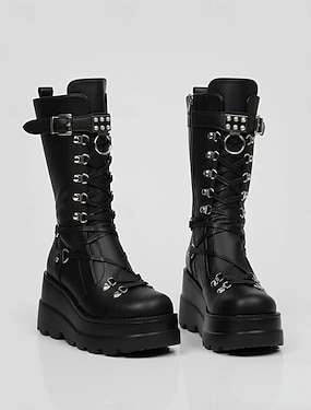 Bottes à plateforme gothiques punk pour femmes - Bottes de combat noires à lacets avec boucle et détails cloutés pour Halloween, cosplay et soirée