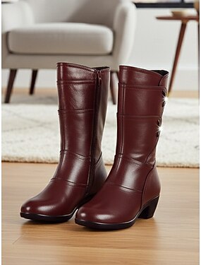 Bottes mi-mollet marron pour femmes avec talons bas et fermeture éclair latérale, chaussures de mode décontractées en cuir confortables pour un usage quotidien, le travail &tenues d'automne et d'hiver