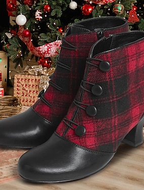 Bottines boutonnées à carreaux victoriens pour femmes – bottines rétro à talons avec fermeture éclair latérale pour les fêtes de Noël et les rassemblements de vacances