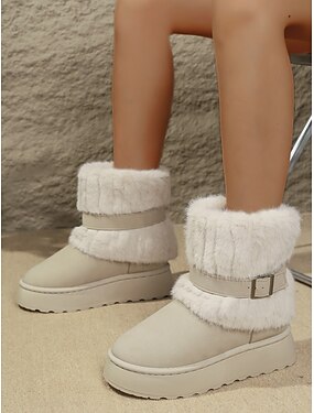 Bottes d'hiver plates pour femmes, doublées de fourrure crème – bottines de neige confortables à boucle et semelle antidérapante pour temps froid