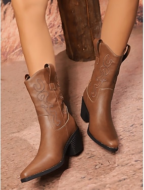 bottes de cowboy marron pour femmes – bottes mi-mollet western avec motif brodé et talon bloc pour rodéo, concerts country et tenues automne-hiver