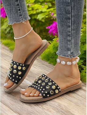 Sandales à enfiler noires cloutées pour femmes – sandales plates tendance à rivets dorés pour l'été, la plage et les sorties décontractées