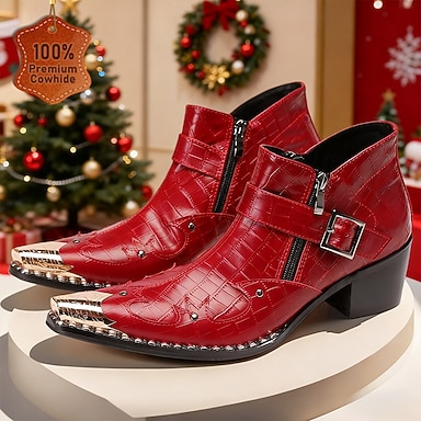 Bottes en cuir rouge pour homme avec boucle et bout pointu – parfaites pour les fêtes de Noël et les événements festifs