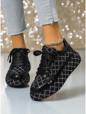 Baskets matelassées à strass pour femmes - Chaussures de soirée à lacets noires et argentées pour la vie nocturne, les clubs et le streetwear tendance