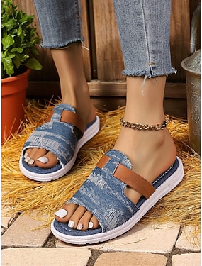 Sandales à enfiler en denim pour femmes avec des accents en similicuir, style ferme rustique chic pour les barbecues dans le jardin, les promenades à la campagne et les tenues décontractées du quotidien