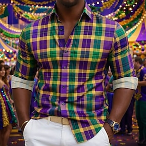 Carnaval Homme Graphique Plaid Chemise Chemise boutonnée Chemise de Plage manche longue Hawaïen Occasionnel Confortable Vacances Fête Mardi Gras Été Printemps Col Rabattu Impression Violet