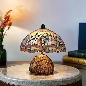 lampe de table libellule, veilleuse artisanale en résine, lampe de table en vitrail simulé