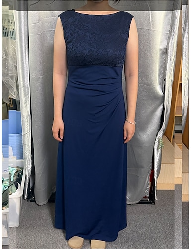 Femmes Robe maxi Robe trapèze Élégant Soirée Cocktail Froncé Dentelle Coupe régulière Couleur Unie Sans manches Col ras du cou bleu marine