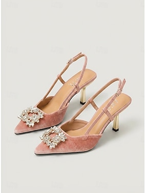 Escarpins roses poudrés à bride arrière pour femme – escarpins en velours à bout pointu ornés d'une broche en strass, parfaits pour une soirée cocktail. &événements en soirée