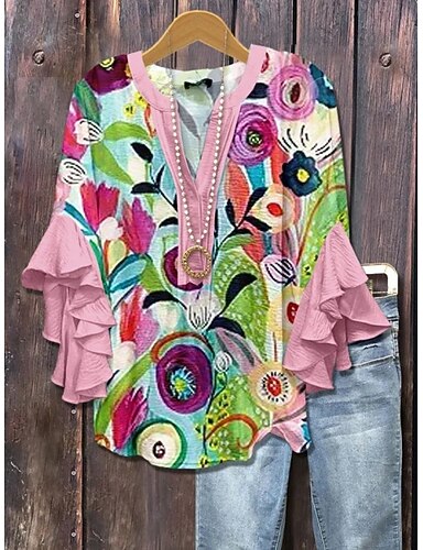 Femmes Chemisier A Volants Imprimé Fleuri Graphique ancien Quotidien Élégant Manche 3/4 Col en V Hauts courts Quotidien Fête Vêtements de vacances Bleu Rose Claire Violet Vert Été Printemps