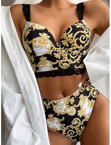 Bikini pour femmes 2 pièces maillot de bain avec armature culottes boho taille basse dos nu vacances plage graphique floral col en V sans manches