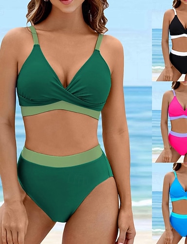 Femmes Maillot de bain 2 Pièces Bikini taille haute Couleur Unie Protection UV Élastique Sans manches Maillot de Bain Maillot de bain Surf Plongée Natation Été
