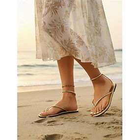 Sandales plates à anneau d'orteil métallique pour femmes, chaussures à enfiler au design minimaliste en coquillage doré pour les vêtements de plage d'été, les vacances et les tenues décontractées