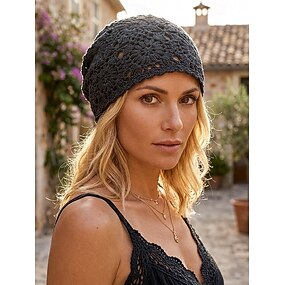 Bonnet bohème fleuri au crochet pour femme, en maille de coton mélangé, disponible en plusieurs couleurs, idéal au quotidien, en voyage ou pour un look balnéaire.