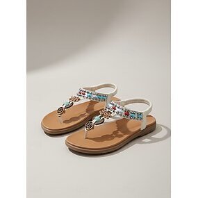 Sandales plates bohèmes à perles pour femmes - sandales ethniques tribales à bride en T et bride élastique à l'arrière, idéales pour les vacances à la plage et les séjours en bord de mer. & été