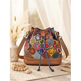 Sac seau bohème en cuir pour femme, motif floral multicolore, polyvalent, bandoulière réglable, parfait pour un usage quotidien décontracté