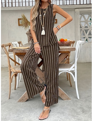 Femmes Survêtement Ensembles de Pantalons Sans manches Col rond Rayé Imprimé Mode Streetwear Occasionnel Quotidien Extérieur Marron Été Coupe Ample
