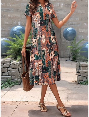 Femmes Robe Midi Robe bohème Robe Décontractée Robe Fleurie Élégant Mode Moderne Extérieur Vacances Sortir Coupe régulière Fleuri Manche Courte Col en V Orange Été Printemps