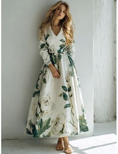 Femmes Robe Midi Robe trapèze Vacances Occasionnel Coupe régulière Fleuri Graphique manche longue Col en V Blanche Printemps Automne Hiver