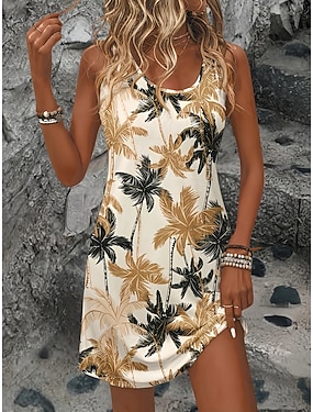 Femmes Mini Robe Robe d'Été Robe trapèze Robe d'été Vacances Occasionnel Boho Plage Soirée Mariage Coupe régulière Graphique Tropical Sans manches Col en U Kaki Été Printemps