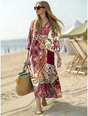 Robe Midi Femme Lin Comme Respirant Léger Robe d'Été Robe A Line Vacances Casual Boho Plage Coupe Ample Graphique Paisley Manches 3/4 Col en V Bleu Rouge Bleu Marine Gris Été Printemps