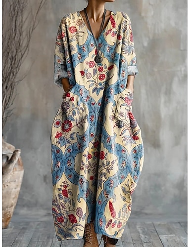 Robe Maxi Femme Lin Comme Respirant Léger Robe d'Été Robe A-Line Vacances Décontractée Boho Plage Sorties Florale Géométrique Manches Longues Col V Bleu Blanc Violet Clair Orange Été Printemps