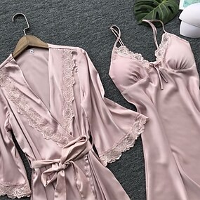 Femmes Pyjamas Robe Chemise de Nuit Occasionnel Doux Satin Couleur Unie Dentelle Patchwork Maison Lit Demi Manches Col en V Argent Jaune Rose Claire Vin Été Coupe Ample