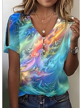 Femmes T-shirt Chemise Henley Graphique Basique Néon & Lumineux Manche Courte Col en V Hauts Réguliers Quotidien Week-end Découpé Boutons Imprimé Bleu Violet Vert