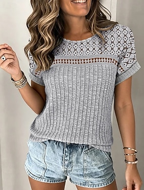 Femmes Chemisier Dentelle Couleur Unie Élégant Classique Occasionnel Manche Courte Col ras du cou Hauts Réguliers Quotidien Bleu Noir Vert Beige Gris Été Printemps