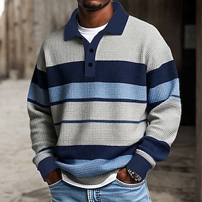 Homme Rayé Chemises Polo Gaufre Polo de rugby manche longue Polos Chemises à Col Occasionnel Athleisure Tenue quotidienne Boutons Printemps Automne Hiver Bleu Violet Vert