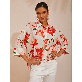 Chemisier blanc à fleurs pour femme, manches 3/4, ample, col rond, décontracté, élégant, vacances, printemps, été, automne