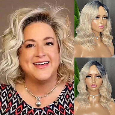 perruque ondulée gris argenté avec frange pour femmeperruques gris ombre longueur d'épaule perruque bouclée bob aspect naturel blanc argenté avec racines foncées cheveux synthétiques pour une