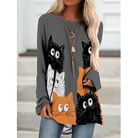 T-shirt Femme Chat Noir Manches Longues Graphique Animal Vintage Chic Classique Manches Longues Col Rond Long Tops Impression Quotidienne Rose Bleu Vert Printemps Automne Préautomne