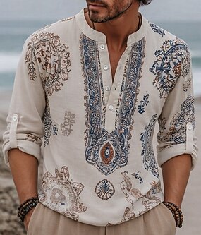 Homme Ethnique Floral complexe Chemise Chemise Boutonnée Chemise Henley manche longue Vintage Rétro Occasionnel Vacances Mariage Été Printemps Col mandarin Col montant Impression 3D Chemise en lin