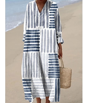 Robe Midi Femme Col V Manches Longues Kaftan Léger Coupe Ample Robe A Ligne Décontractée Boho Sortie Graphique Géométrique Rayée Manches Longues Col V Cendre Noir Jaune Bleu Automne