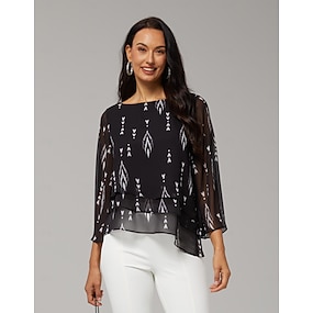 Chemisier femme noir à fleurs, manches 3/4, ample, col rond, décontracté, élégant, vacances, printemps, été, automne