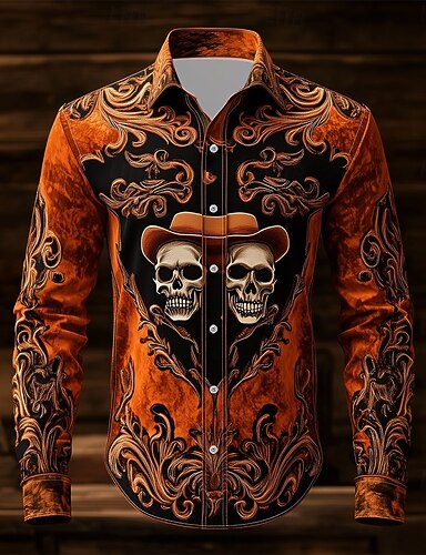 Homme Paisley Crâne Jour des Morts Chemise Chemise Western Chemise de cow-boy manche longue Vintage Rétro Extérieur Vacances Printemps Automne Col Rabattu Impression 3D Chemise en lin Orange