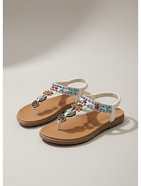 Sandales bohèmes beiges pour femmes - chaussures de marche à bride en T ornées de strass scintillants et dotées d'une bride arrière élastique confortable, idéales pour les vacances en plein air et les