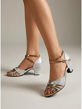Sandales de danse à talons bas et paillettes dorées pour femmes – Chaussures de danse latine scintillantes avec brides croisées pour artistes adultes et entraînement