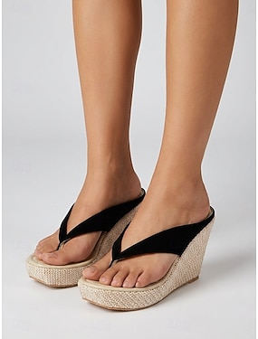 Sandales compensées noires à entre-doigts pour femmes - élégantes sandales à plateforme en daim avec semelle espadrille tressée, idéales pour les vacances sur les îles et les escapades tropicales à la