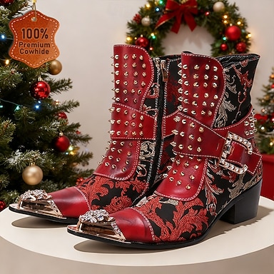 Bottines gothiques brodées en cuir véritable rouge pour hommes avec sangles à double boucle et embout en métal, bottines western 100 % cuir de vache pour scène, fêtes et défilés de mode