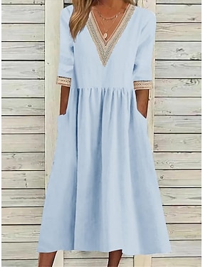 Femmes Robe Midi Faux coton lin Robe fourreau Robe Décontractée Basique Moderne Quotidien Week-end Coupe Ample Uni Demi Manches Col en V Bleu Blanche bleu marine Abricot Été Printemps