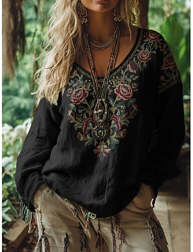 Femmes T-shirt bohème T-shirt Imprimé Fleuri ancien Ethnique Occasionnel manche longue Col en V Hauts Réguliers Quotidien Week-end Vêtements de vacances Noir Rose Claire Printemps Automne