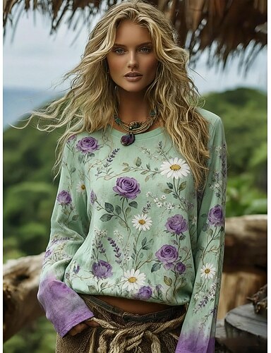 Femmes T-shirt Imprimé Fleuri Mode Élégant Occasionnel manche longue Col ras du cou Hauts Réguliers Quotidien Week-end Vêtements de vacances Jaune Rouge Vert foncé Violet Vert Été Printemps Automne