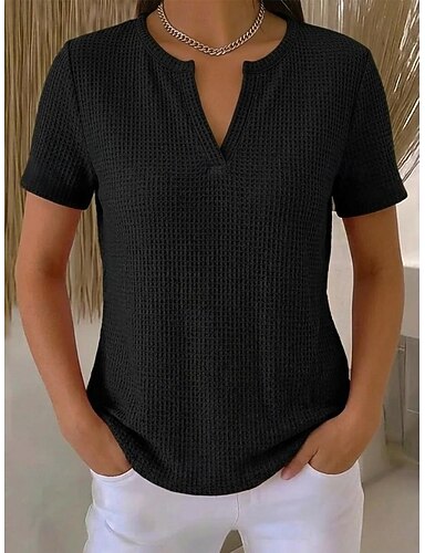 Femmes Tee-shirt Gaufre T-shirt Couleur Unie Élégant Occasionnel Manche Courte Col en V Hauts Réguliers Quotidien Sortir Noir Jaune Vin Gris Été Printemps