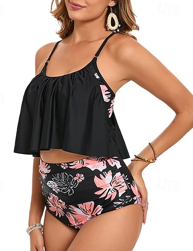 Femmes Tankini Maillot De Bain Deux Pièces Dos nageur Maillot de Bain Floral Maillots de Bain Noir Rose Claire Respirant Séchage Rapide Sans manches - Natation Surf Plongée en apnée Été