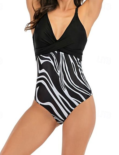 Femme Maillot de bain 1 pièce V Profond Découpé Maillots de Bain Mosaïque Maillots de Bain Noir Blanche Respirable Séchage rapide Poids Léger Sans Manches - Natation Surf Plage Eté Printemps