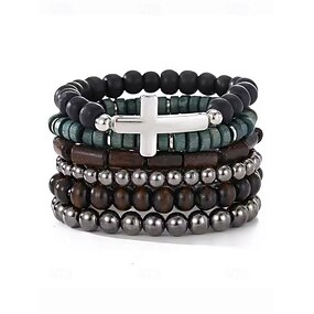 Ensemble de bracelets en perles pour hommes avec breloque en croix, bracelets extensibles multicouches en bois et en métal, bijoux bohème tendance pour un usage décontracté, de fête et de tous les jours